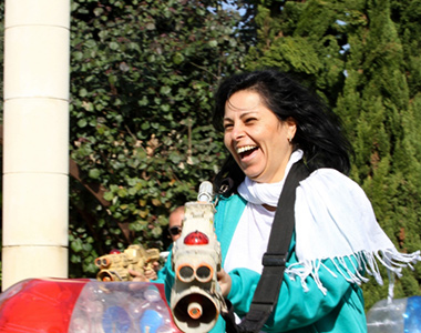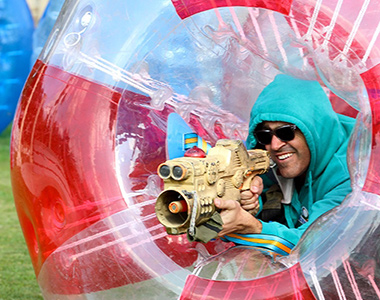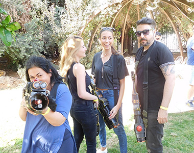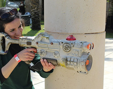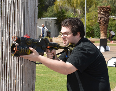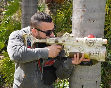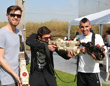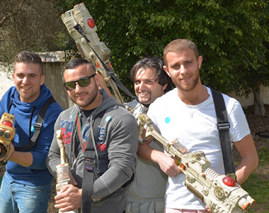משחק מלחמה תחרותי בין שתי קבוצות עם רובי לייזר מגניבים על מדשאות הגן,